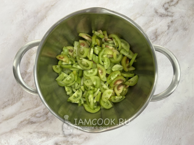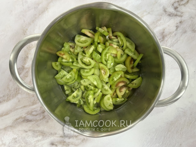 Тщательно промойте зелёные помидоры холодной водой. Нарежьте их полукольцами толщиной 0,2-0,3 см.