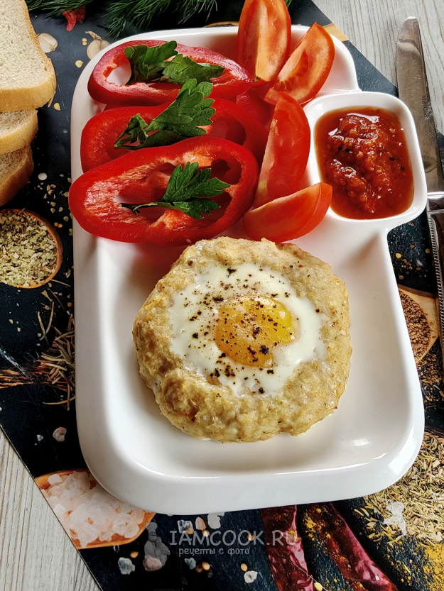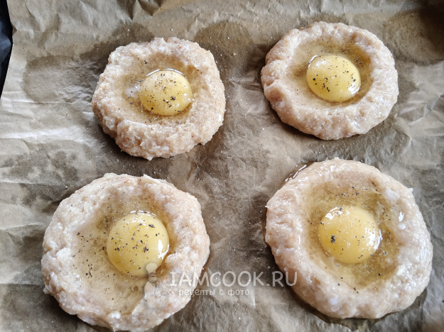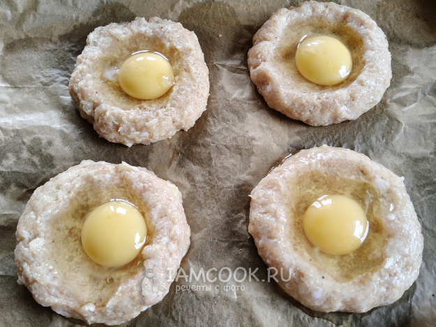 Гнезда из куриного фарша с яйцом запекать при температуре 180 градусов 25-30 минут. Можно ориентироваться по белку яйца, он должен полностью схватиться.