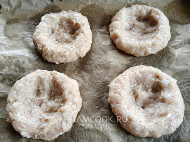 Разделить фарш на 4 части, скатать шары, выложить на противень и в центре сделать углубление.