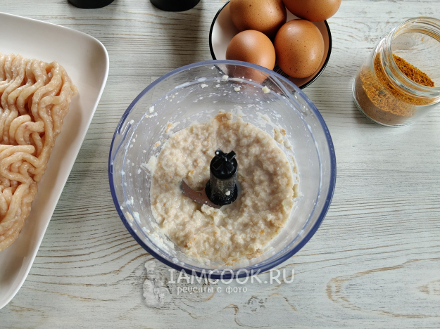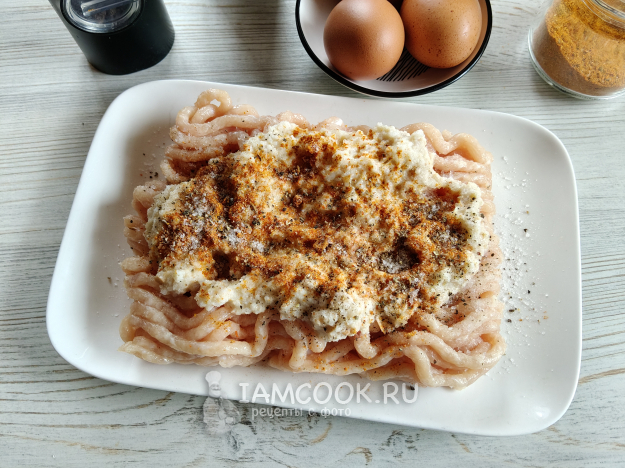 Добавить массу в фарш. Посолить, поперчить, приправить специями.