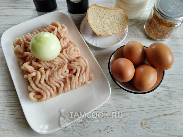 Возьмите необходимые ингредиенты, чтобы приготовить гнезда из куриного фарша с яйцом в духовке.