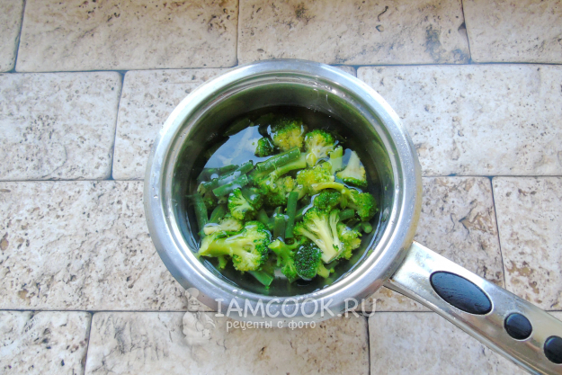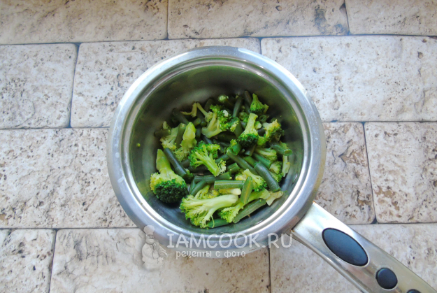 Стручковую фасоль и брокколи помойте и выложите в кастрюлю. Залейте водой, немного посолите.
