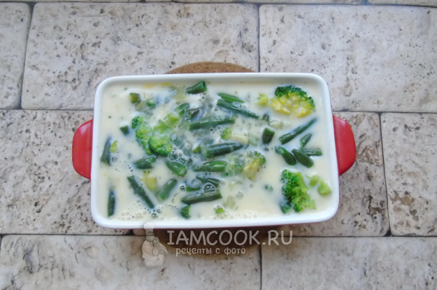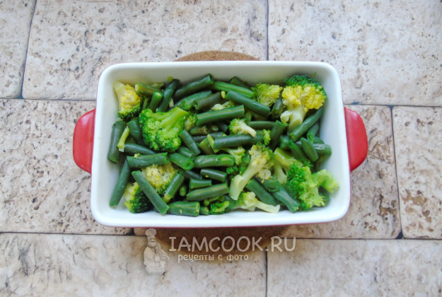 Форму для запекания смажьте маслом и выложите брокколи со стручковой фасолью.