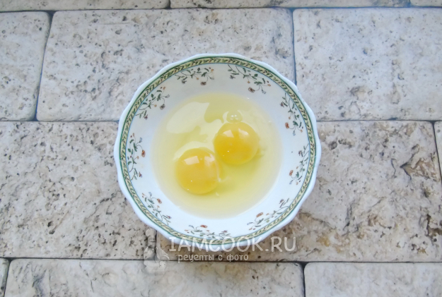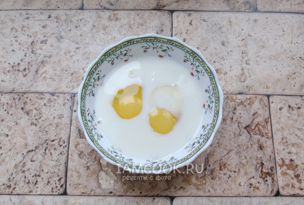 Приготовьте заливку. Яйца разбейте в мисочку.