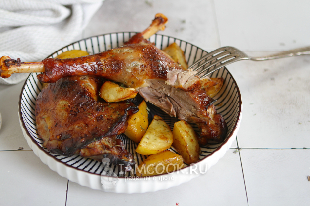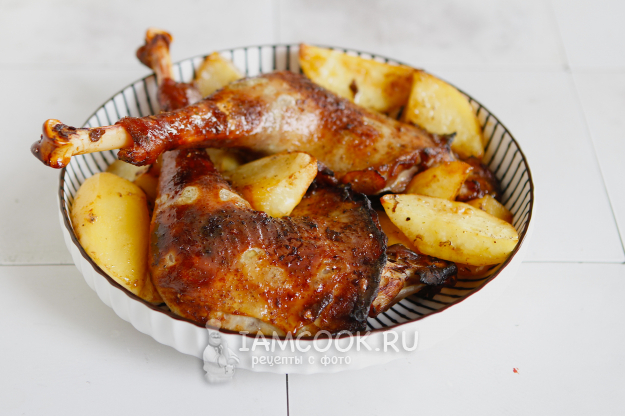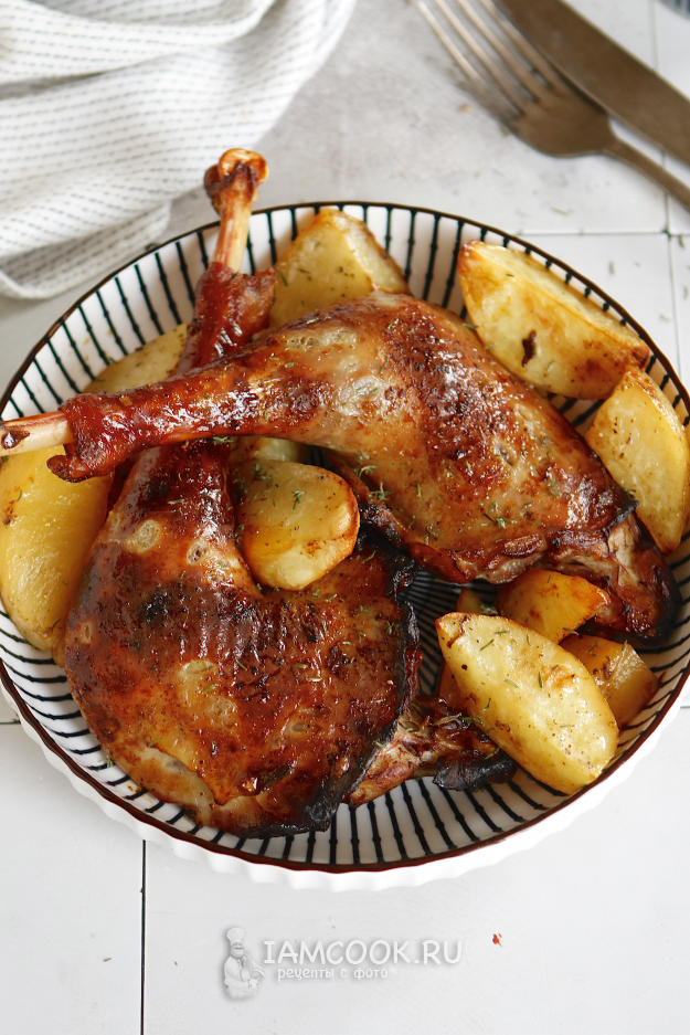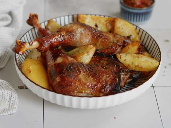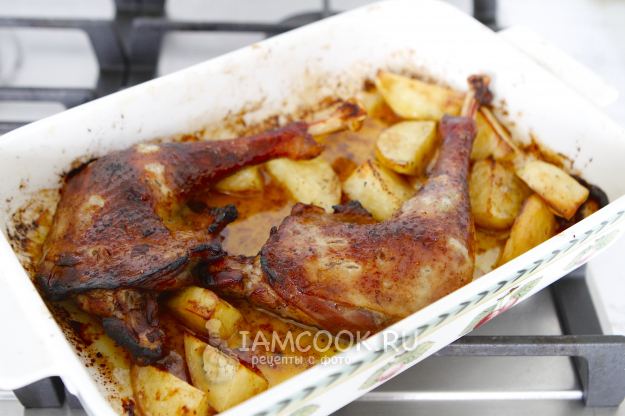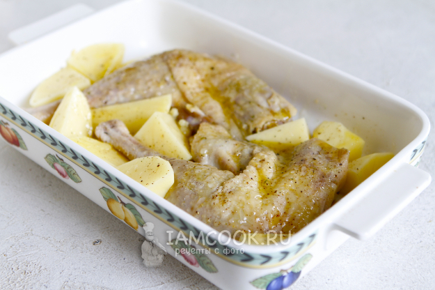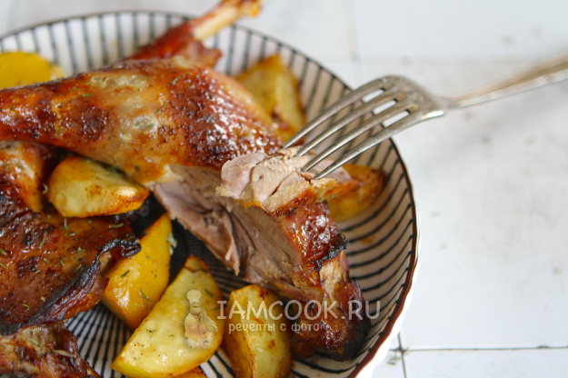 Перед запеканием достаньте ножки индейки из холодильника, слегка обсушите их бумажным полотенцем. Выложите в форму. Я подавала ножки с картофелем, который запекала сразу вместе с ножками в одной форме. Форму отправьте в заранее разогретую духовку.