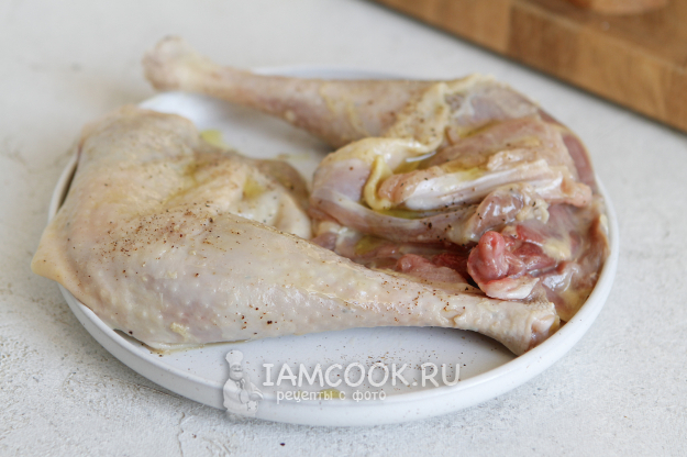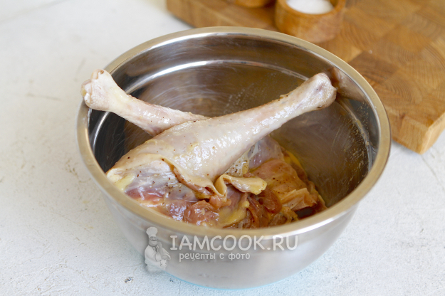 Ножки индейки натрите с двух сторон солью и молотым черным перцем. Залейте маринадом.