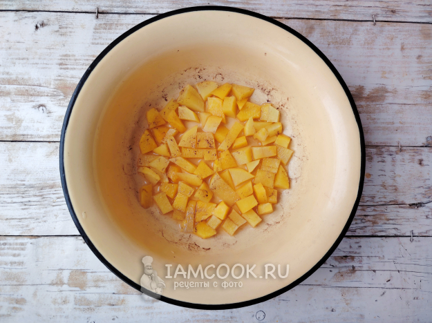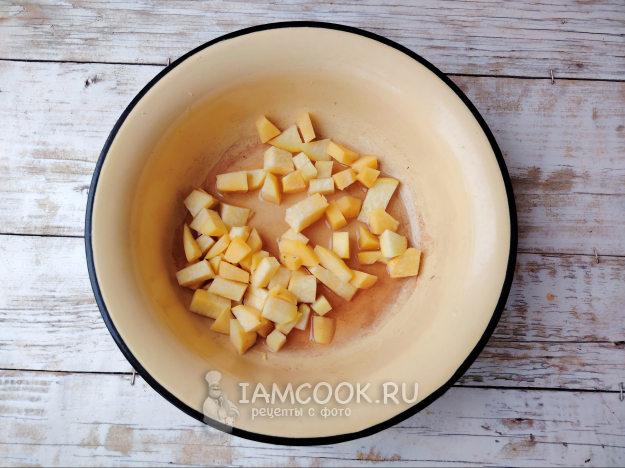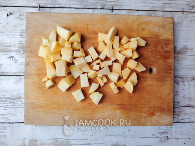 Репку почистить. Если она молодая, нарезать ее кубиками или ломтиками, если грубоватая, то можно натереть на терке.