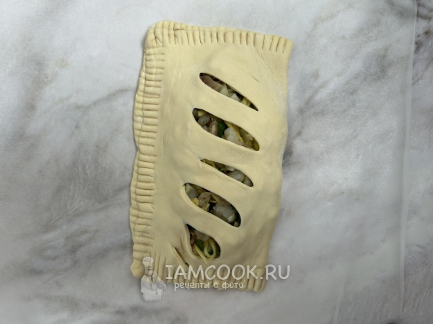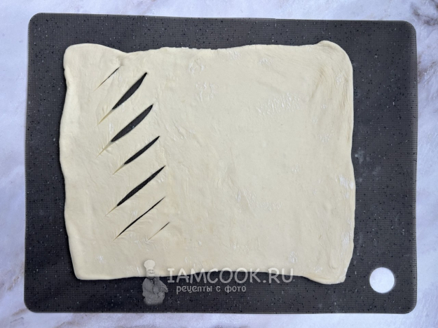 Раскатайте тесто в прямоугольник толщиной примерно 3 мм. С одной стороны сделайте прорези.