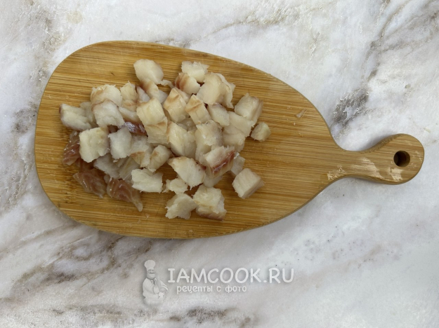 Филе трески промойте, обсушите бумажным полотенцем и нарежьте на средние кусочки.