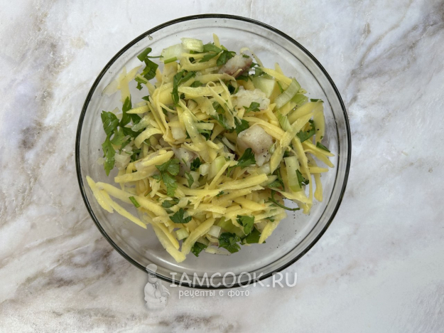 Смешайте в миске рыбу, картофель, лук и петрушку, добавьте соль и черный молотый перец по вкусу. Хорошо перемешайте начинку.