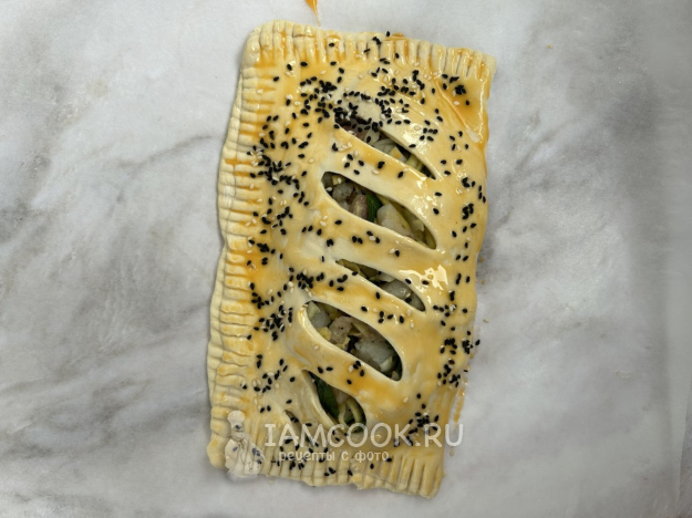 Отделите белок от желтка. Желтком с помощью кисточки смажьте тесто пирога, посыпьте смесью кунжута. Выпекайте пирог с треской из слоеного теста в разогретой до 180 градусов духовке 25-30 минут, до появления золотистой корочки.