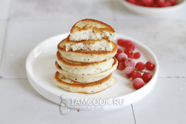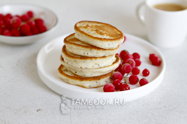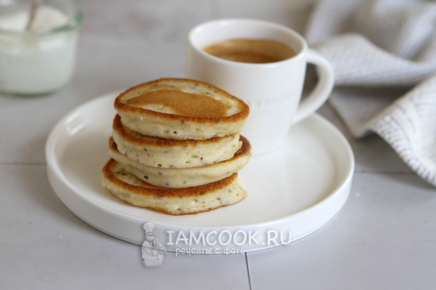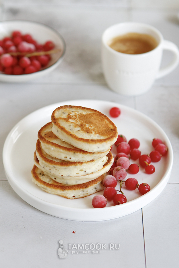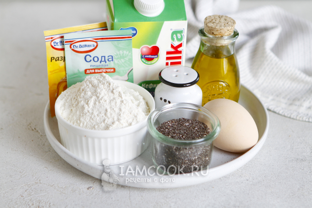 Перед вами весь набор продуктов, который нам понадобится для приготовления оладий с семенами чиа. Тесто на оладьи будем замешивать на кефире. Я всегда выбираю кефир с истекшим сроком годности. Жирность кефира не играет большой роли.