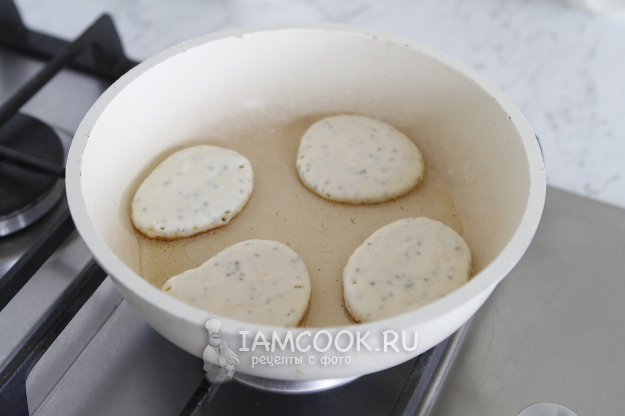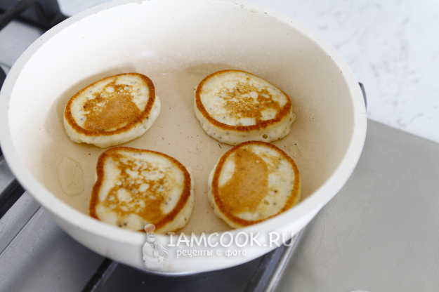 Жарьте оладьи с двух сторон на небольшом огне, примерно по 1,5 минуты, до золотистого цвета с обеих сторон.