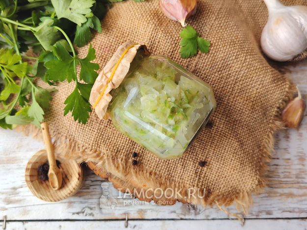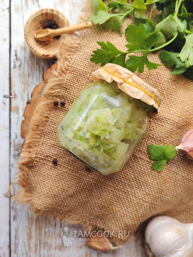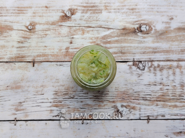 Разложить салат по стерильным баночкам. Остатки маринада также влить в банки, чтобы масса была закрыта жидкостью.