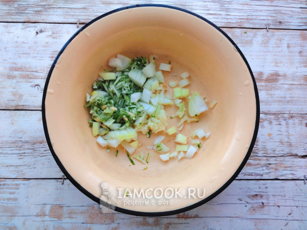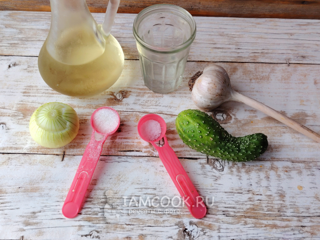 В кастрюлю или иную посуду налить масло, добавить овощи. Перемешать, оставить на ночь в холодильнике, чтобы огурцы пустили сок.