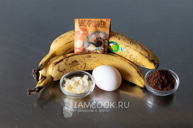 Соберём ингредиенты для приготовления ПП-десерта из банана, какао и яйца, исходя из расчёта, что на одну порцию, как на фотографии, нам потребуется приблизительно 1 банан, 1 яйцо и чайная ложка какао. Можно сделать всё в одной большой миске (это увеличит время выпекания). А можно, наоборот, разлить по маленьким, миллилитров на 100, тогда получится больше порций.
