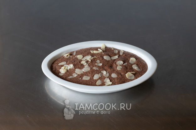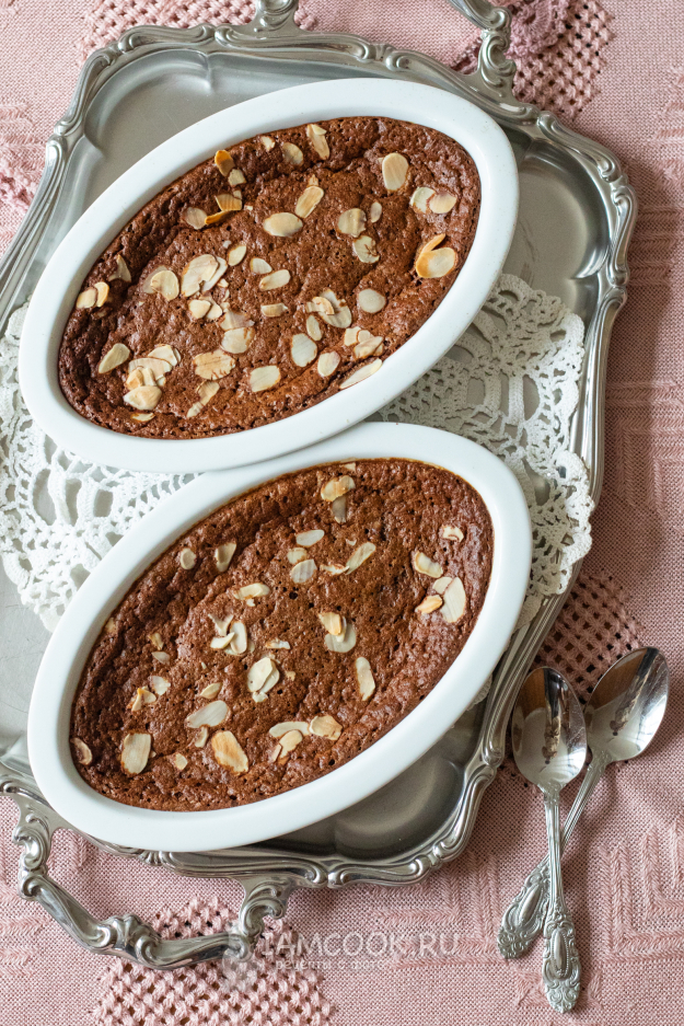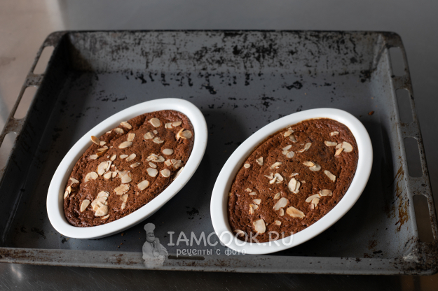 Выпекание производится в духовке на среднем уровне при температуре 180°С с циркуляцией воздуха приблизительно 20 минут (до тех пор, пока орехи не зазолотятся, а масса не утратит текучесть). Где-то минут через 10, когда она уже начнёт подниматься, посмотрите, как она тилипается под корочкой - так вот, минут ещё через 10 готовность наступит, когда десерт полностью утратит эту внутреннюю текучесть, но ещё сохранит совсем-совсем лёгкую подвижность, он будет не переливаться, а лишь чуточку подрагивать, когда вы прикасаетесь к форме. Полной стабилизации добиваться не нужно, это уже пересушенность.