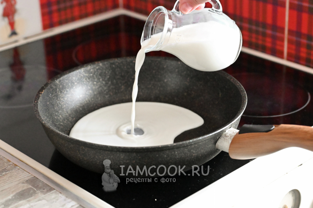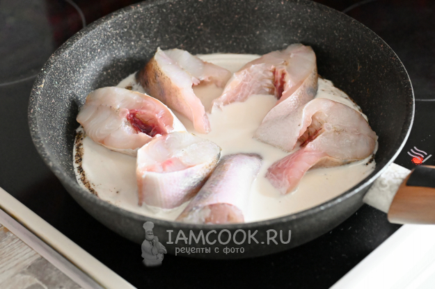 В сковороду влейте молоко. Столько, чтобы оно покрыло кусочки рыбы примерно наполовину.