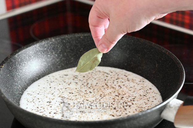 Добавьте в молоко по вкусу соль, перец и лавровый лист. Доведите до кипения.