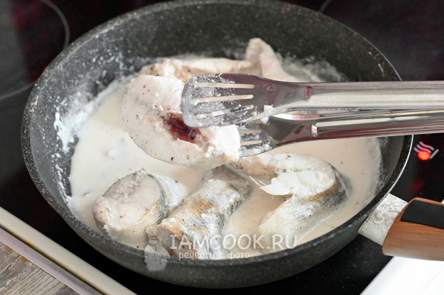 В кипящее молоко опустите кусочки судака, накройте сковороду крышкой и убавьте огонь до среднего.