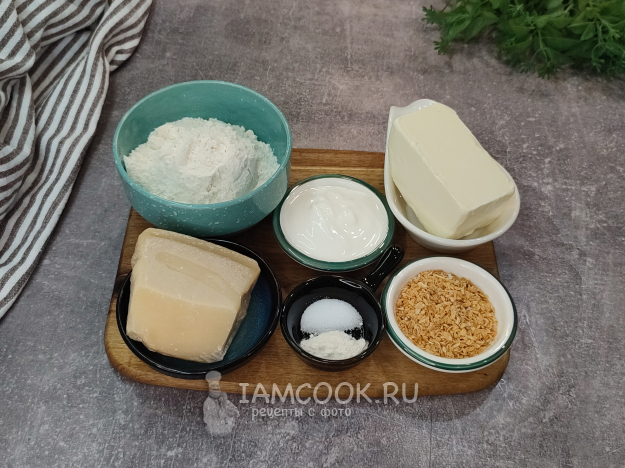 Соберите ингредиенты для приготовления печенья с пармезаном. Сегодня хочу добавить сушеного лука, вы можете использовать другие специи, сушеные ароматные травы или острый чили, например, а можно и вовсе без них. Сметану можно заменить на одно куриное яйцо или такое же количество майонеза.