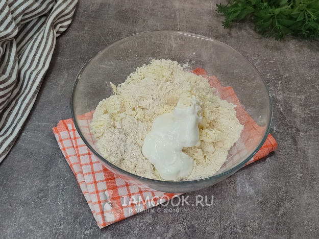 В миске смешайте муку, соль, разрыхлитель, сушеный лук, натертый сыр.