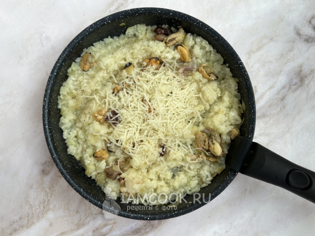 Сыр натрите на средней терке, добавьте к рису с морепродуктами, перемешайте и уберите с огня.