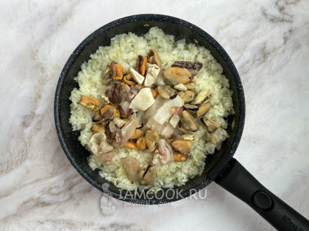 Когда рис почти готов (аль-денте), добавьте размороженный морской коктейль, соль, черный молотый перец и продолжайте готовить еще 5-7 минут.