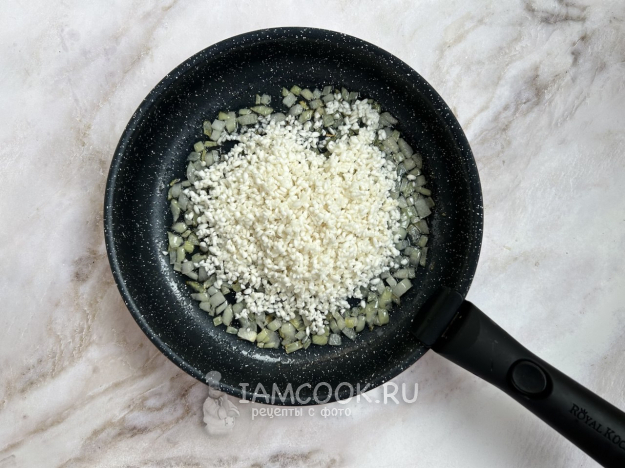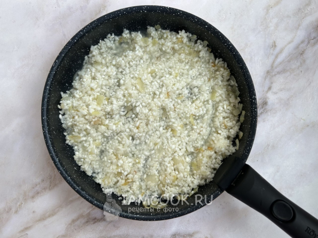 Насыпьте рис в сковороду и хорошо перемешайте с луком и маслом, пока зерна риса не станут прозрачными по краям.