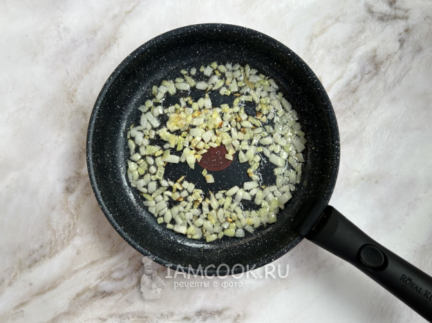 Нагрейте оливковое масло на сковороде на умеренном огне. Добавьте мелко нарезанный лук и пропущенный через пресс чеснок, обжарьте 3-4 минуты, до мягкости лука.