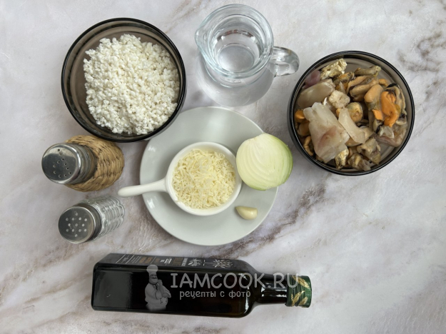 Соберите все необходимые ингредиенты для приготовления ПП ризотто с морепродуктами по списку. Оттайте морепродукты естественным путем, хорошо промойте рис.