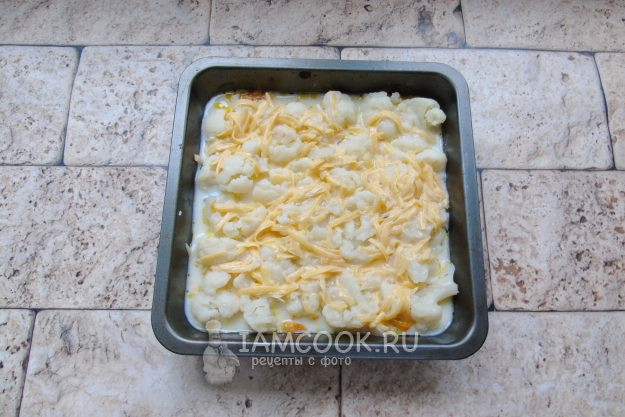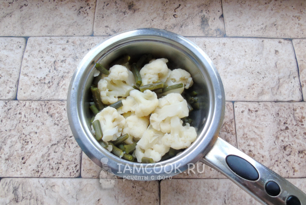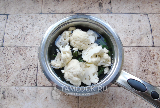 Цветную капусту разберите на соцветия и добавьте в кастрюлю к фасоли. Залейте водой и немного посолите.