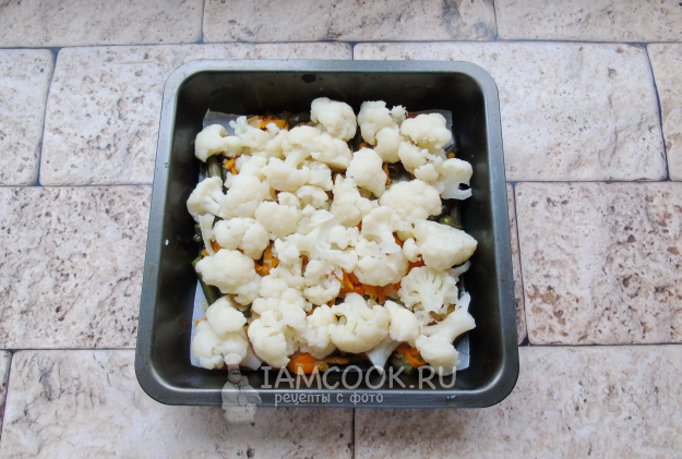 Запекайте цветную капусту со стручковой фасолью в духовке 25-30 минут при температуре 180-185 градусов.