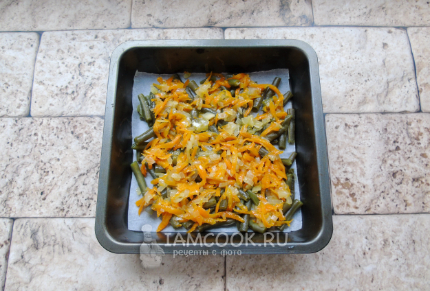 Отварную стручковую фасоль выложите в форму для запекания, которую застелите пекарской бумагой или смажьте растительным маслом.