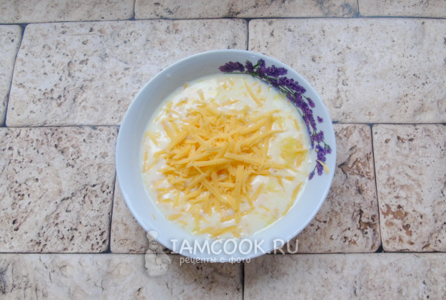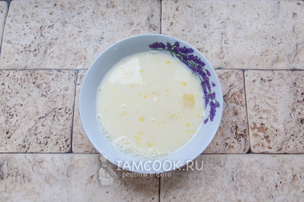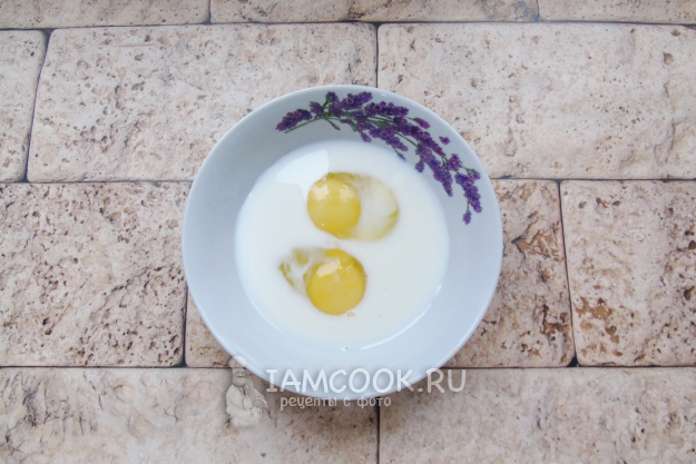 Приготовьте заливку. В мисочку разбейте яйца, залейте молоком или сливками 10-15%.