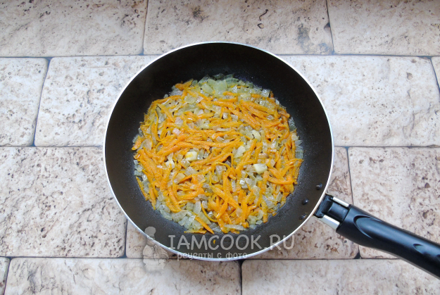 А пока овощи варятся, лук и морковь очистите, помойте. Лук мелко нарежьте, а морковь натрите на терке. Выложите в сковороду с растительным маслом и пассеруйте 6-7 минут.