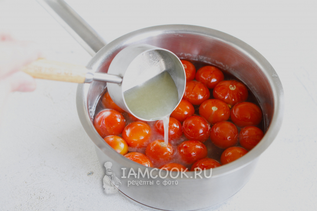 Когда помидоры полностью остынут, вновь сотейник отправьте на плиту. Доведите содержимое до кипения, а затем влейте лимонный сок.