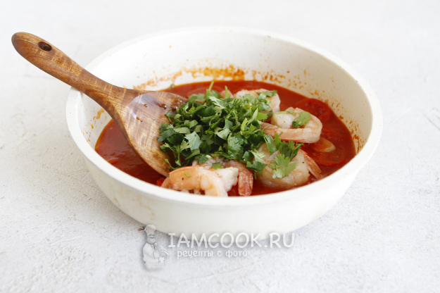 Кинзу или петрушку мелко порубите, добавьте в томатный соус вместе с креветками.