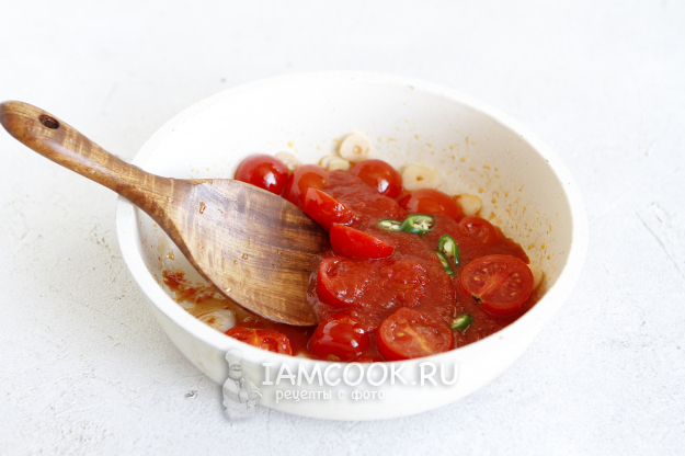 Добавьте перетертые томаты, немного соли, перец чили, нарезанный небольшими шайбами, предварительно очистив его от семян, и тушите 5-7 минут на среднем огне. Если под рукой не будет готовых перетертых томатов, то приготовьте их сами. Помидоры ошпарьте кипятком, снимите кожуру, нарежьте на 2-4 части и пробейте их в блендере.