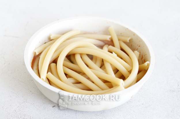 Кастрюлю заполните водой, доведите воду до кипения, посолите. Отварите макароны согласно инструкции на упаковке, до состояния аль-денте. Макароны откиньте на дуршлаг, сохранив примерно 100 мл отвара.