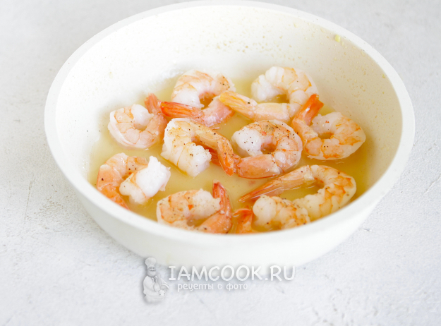 Разогрейте сковороду с оливковым или с кусочком сливочного масла. На умеренном огне в течение 5 минут обжарьте креветки.