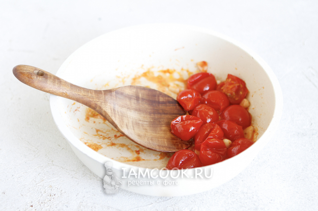 Обжарьте чеснок с помидорами на этой же сковороде.