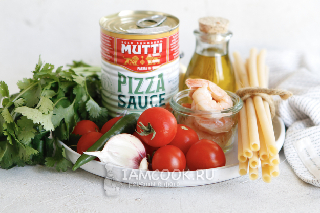 Соберите все продукты по списку и приступим к приготовлению макарон с креветками в томатном соусе.