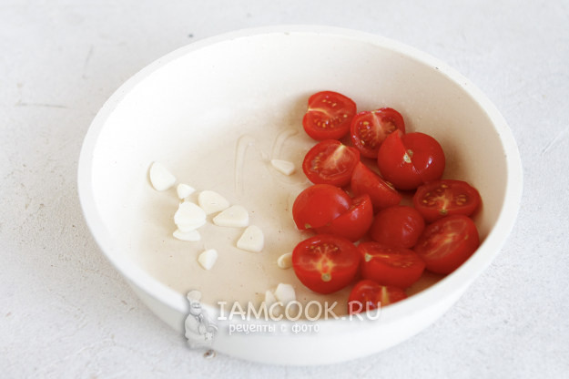 Выложите креветки в миску и отложите их пока в сторону. Почистите чеснок, нарежьте его на небольшие слайсы. Помидоры черри промойте, обсушите и разрежьте пополам.