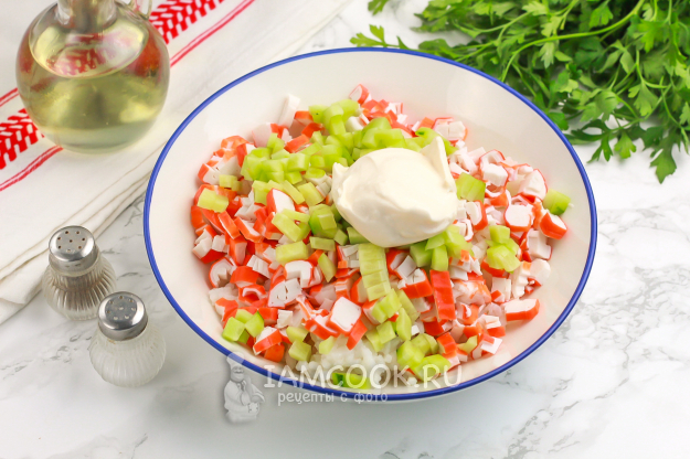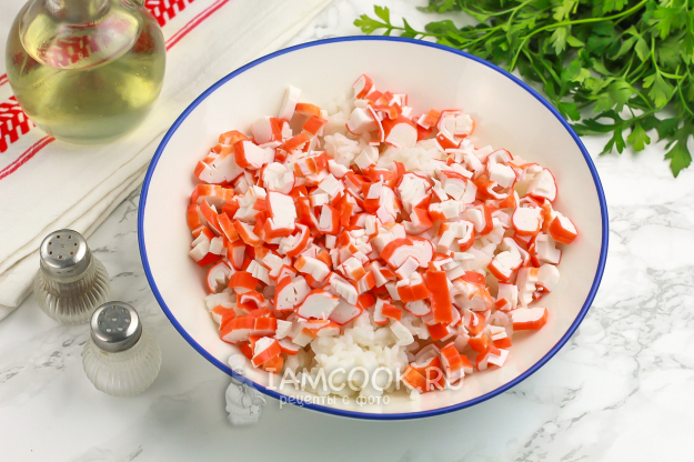 Пока рис остывает, очистите крабовые палочки от оберток, нарежьте мелкими кубиками. Добавьте нарезку к рису.