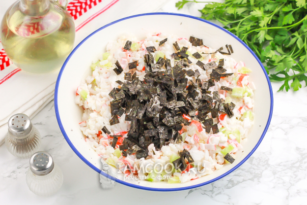 Листы нори нарежьте мелкими кубиками, полосками - как вам удобно. Насыпьте в емкость. По желанию можете оставить один лист нори и нарезать его порционными квадратиками, прямоугольниками - для подачи.