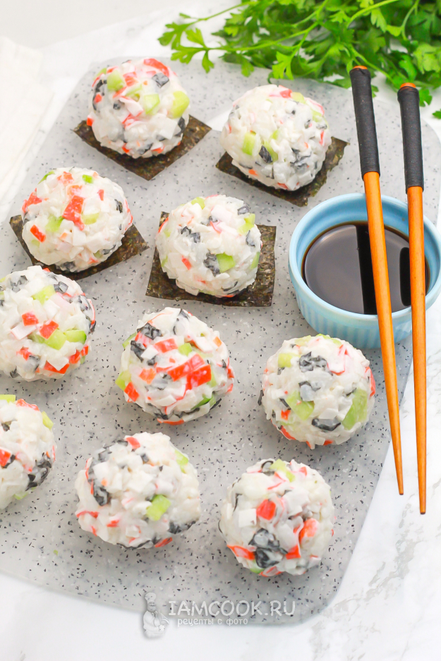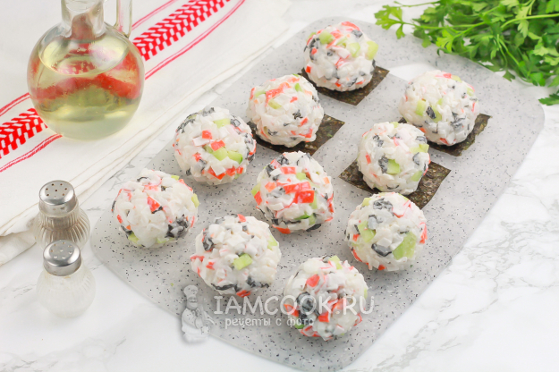 Аккуратно перемешайте всю массу и смочите руки в воде. Сформируйте из массы колобки одинакового размера и выложите их на тарелку, доску или на квадратики нори.