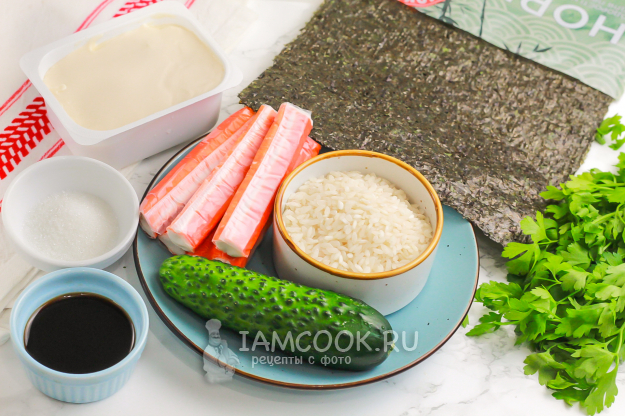 Продукты для приготовления ленивых роллов с крабовыми палочками - перед вами!