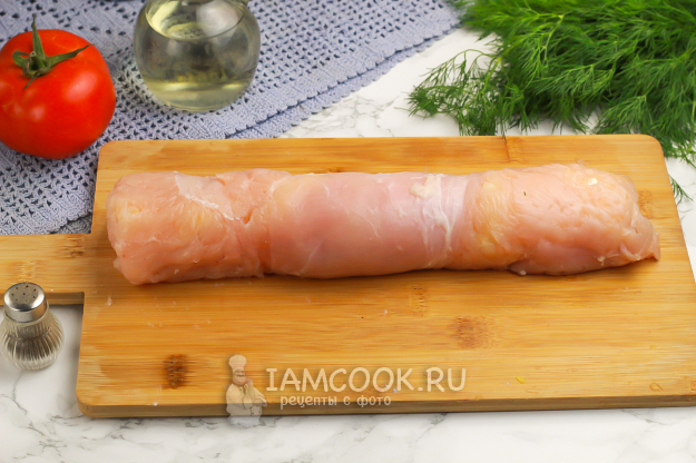 Куриное филе зачистите от пленок, удалите кости, если они есть сверху, и промойте в воде. Обсушите бумажной салфеткой и визуально разделите на три яруса по высоте. Начните надрезать его так, чтобы слой снизу остался в два раза больше. Не надрезайте до конца, а разверните и подрежьте еще раз, чтобы филе раскрылось как книжка. Важно его именно распластать, для того чтобы отбить. Если нечаянно подрежете его до отверстия - ничего страшного, тогда на этот край будете выкладывать начинку и отверстие останется внутри рулета.