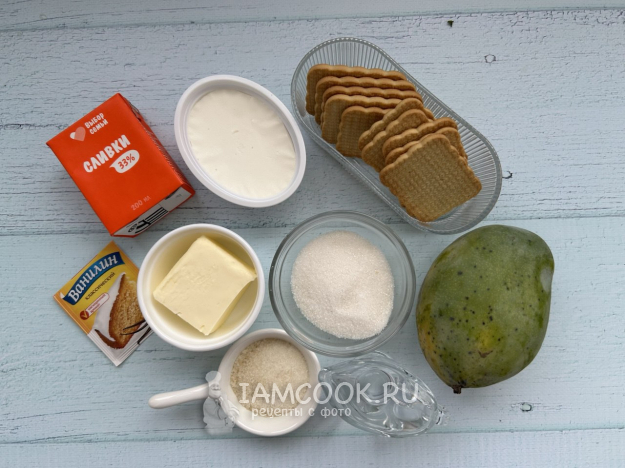 Соберите все необходимые ингредиенты для приготовления чизкейка с манго по списку.